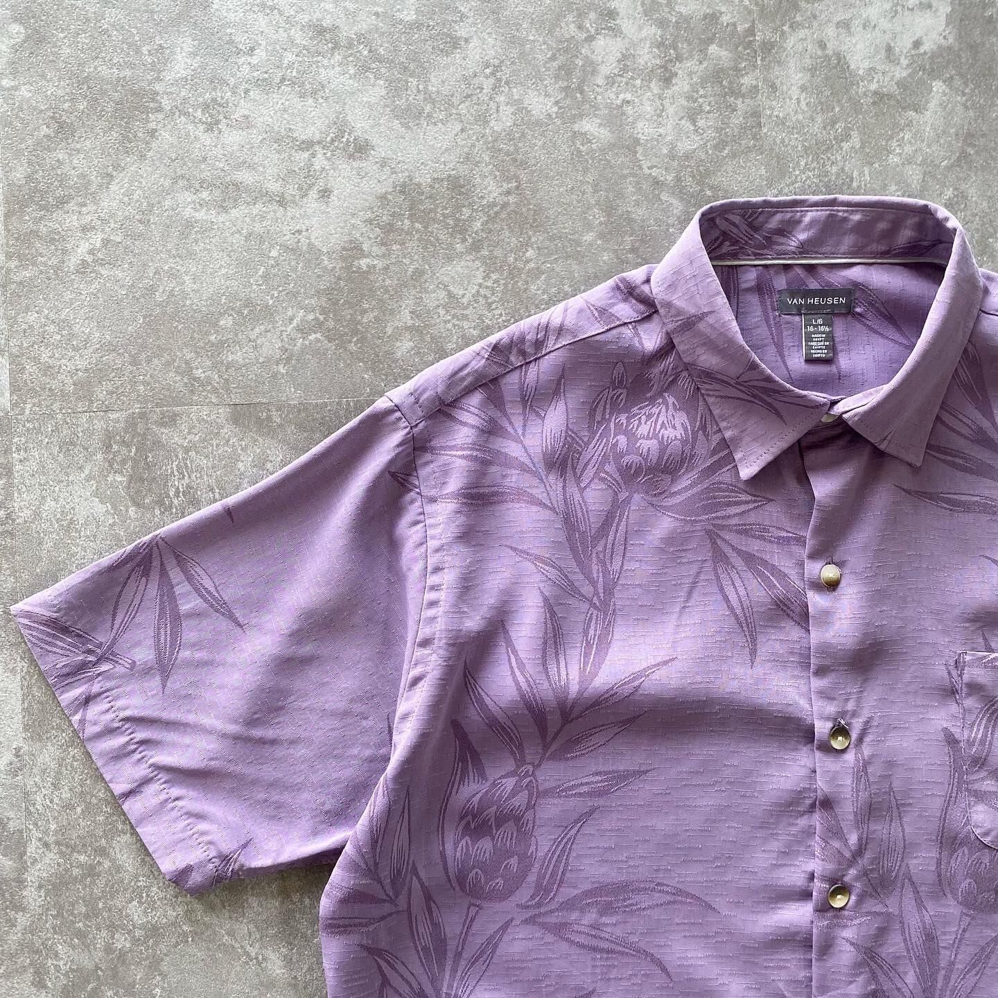 鮮やかなラベンダーカラーの半袖シャツ。